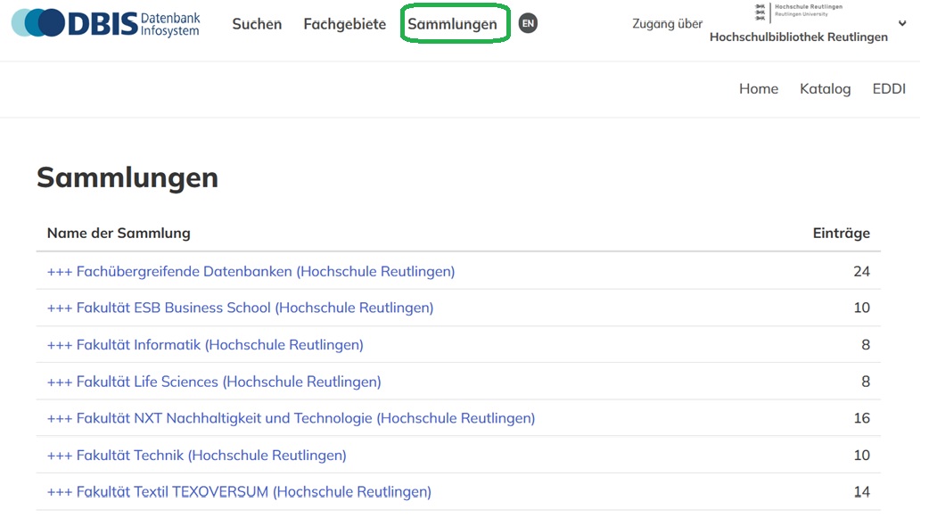 Über den Menüpunkt „Sammlungen“ finden Sie die wichtigsten Datenbanken für Ihre Fakultät.