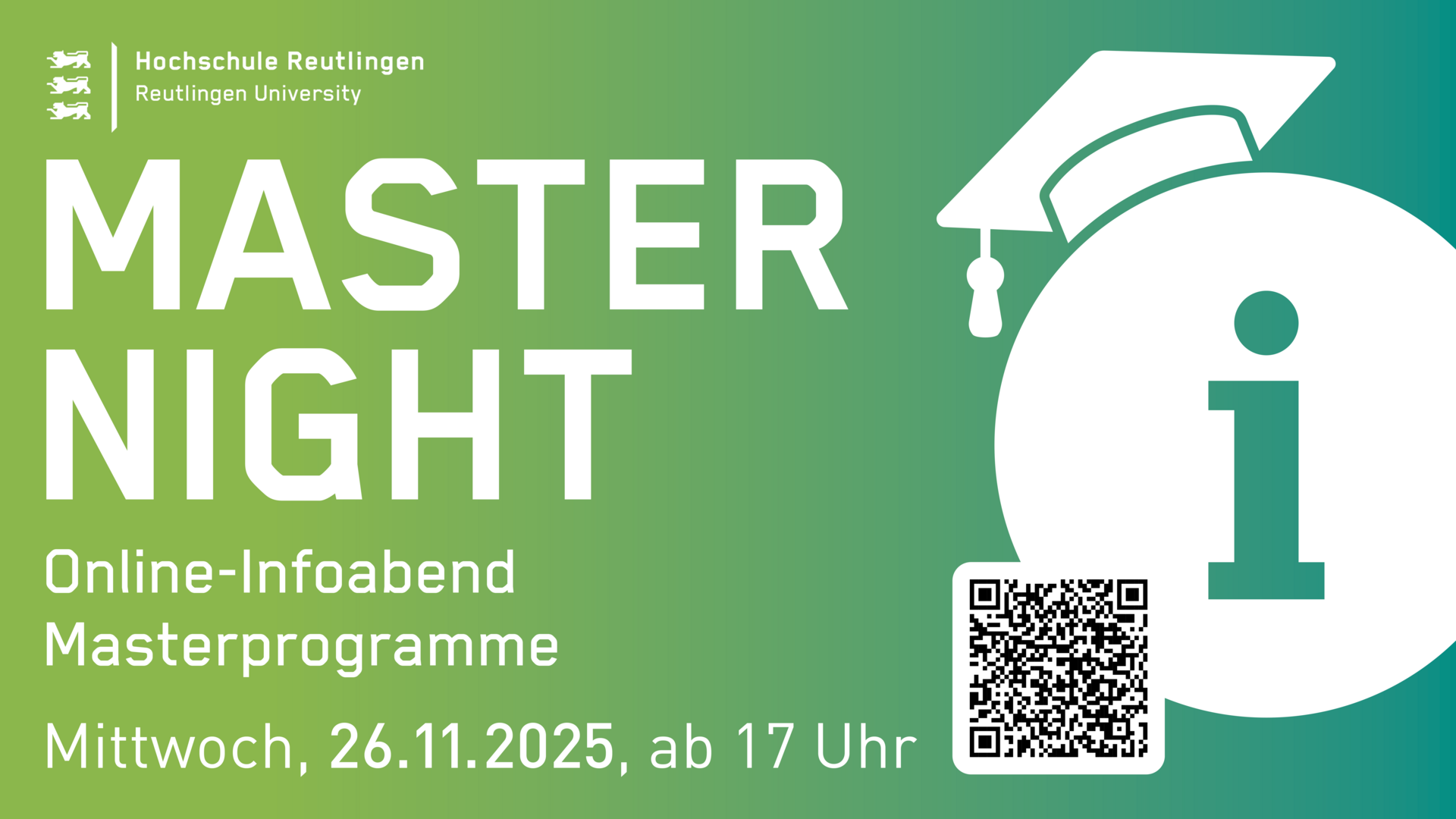 Welche Master-Studiengänge gibt es an der Hochschule Reutlingen? Welcher Master passt zu meinem Bachelor und wie läuft er genau ab? Die digitale Master Night ist die optimale Gelegenheit für alle Interessierten, sich im persönlichen Gespräch über das Masterstudium, Forschungs- und Promotionsmöglichkeiten sowie Weiterbildungsprogramme an der Hochschule zu informieren.