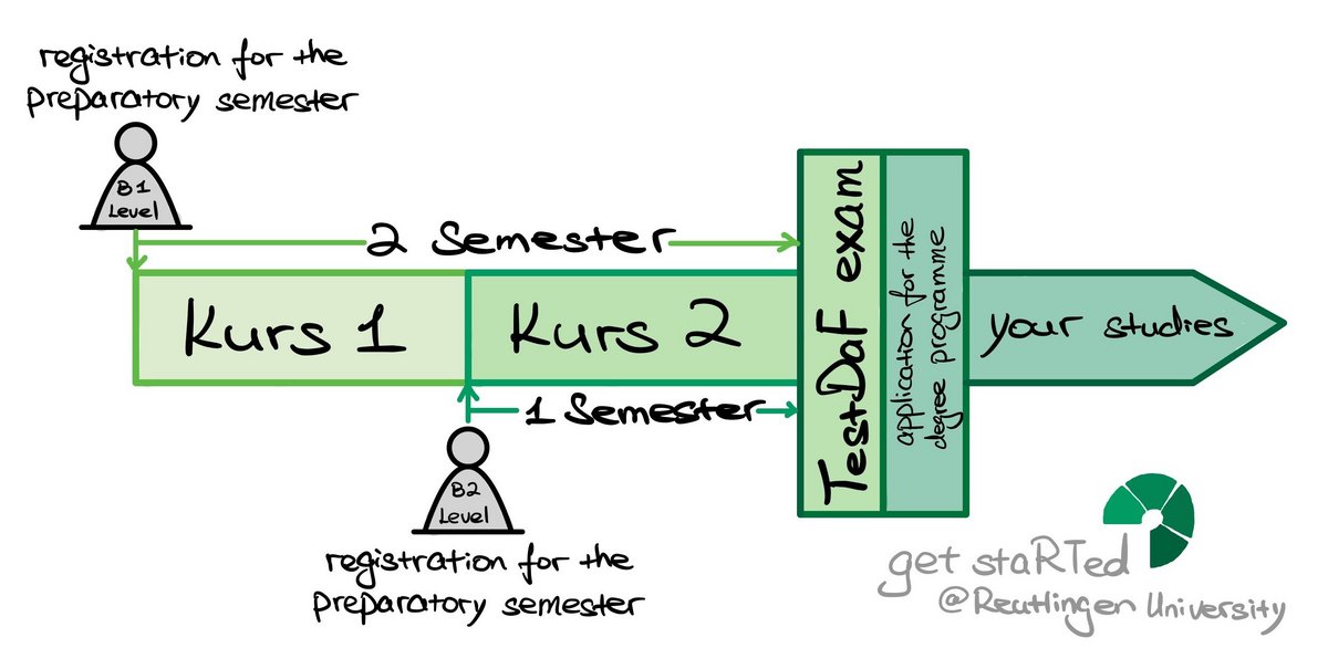 If you can provide proof of German language skills at level B1, you can register for Course 1 (B2 level). Upon successful completion of Course 1 (B2 level), you may register for Course 2 (TestDaF preparation course) in the following semester and take the TestDaF exam.