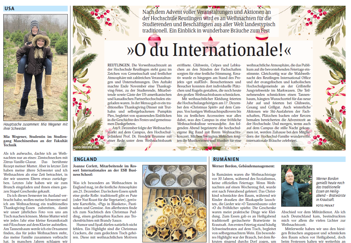 Nach einem Advent voller Veranstaltungen und Aktionen an der Hochschule Reutlingen wird es an Weihnachten für die Studierenden und Beschäftigten aus aller Welt landestypisch traditionell. Ein Einblick in wunderbare Bräuche zum Fest bietet die Campusseite Dezember.