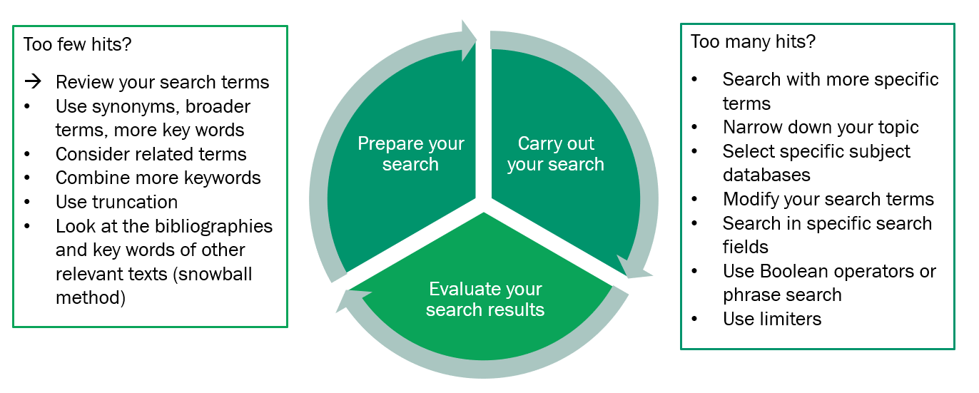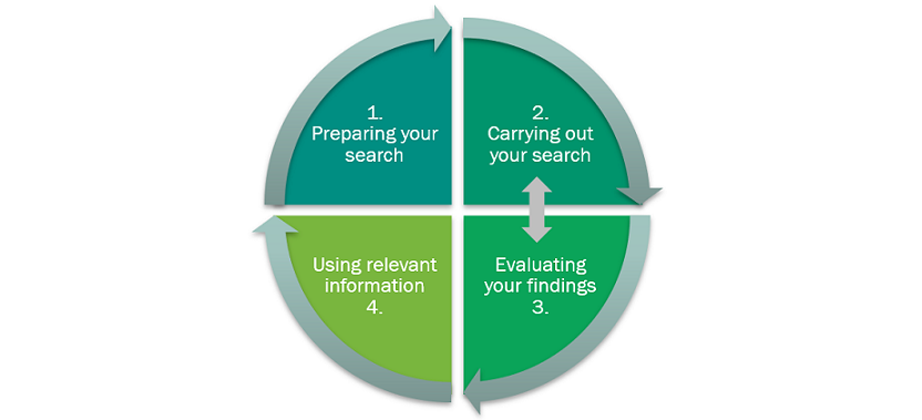 Well-founded research consists of four stages: preparing the search, the research itself, evaluating the sources found and using the relevant information. The research and evaluation stages interact: depending on the relevance of the literature found, you can modify and adapt your search.