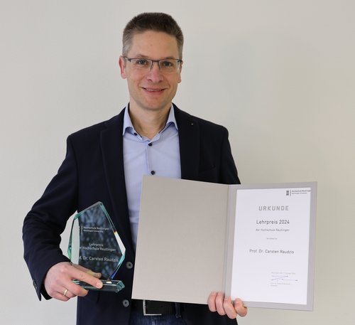 Reutlingen University honours lecturers who show particular commitment and innovative teaching methods to provide an excellent education. In this way, innovative and sustainable teaching is made visible and receives the recognition it deserves. Students and deans of the faculties nominate potential award winners and a decision is then made by a participatory committee. The prize, which is endowed with 5,000 euros, is presented during the semester address.