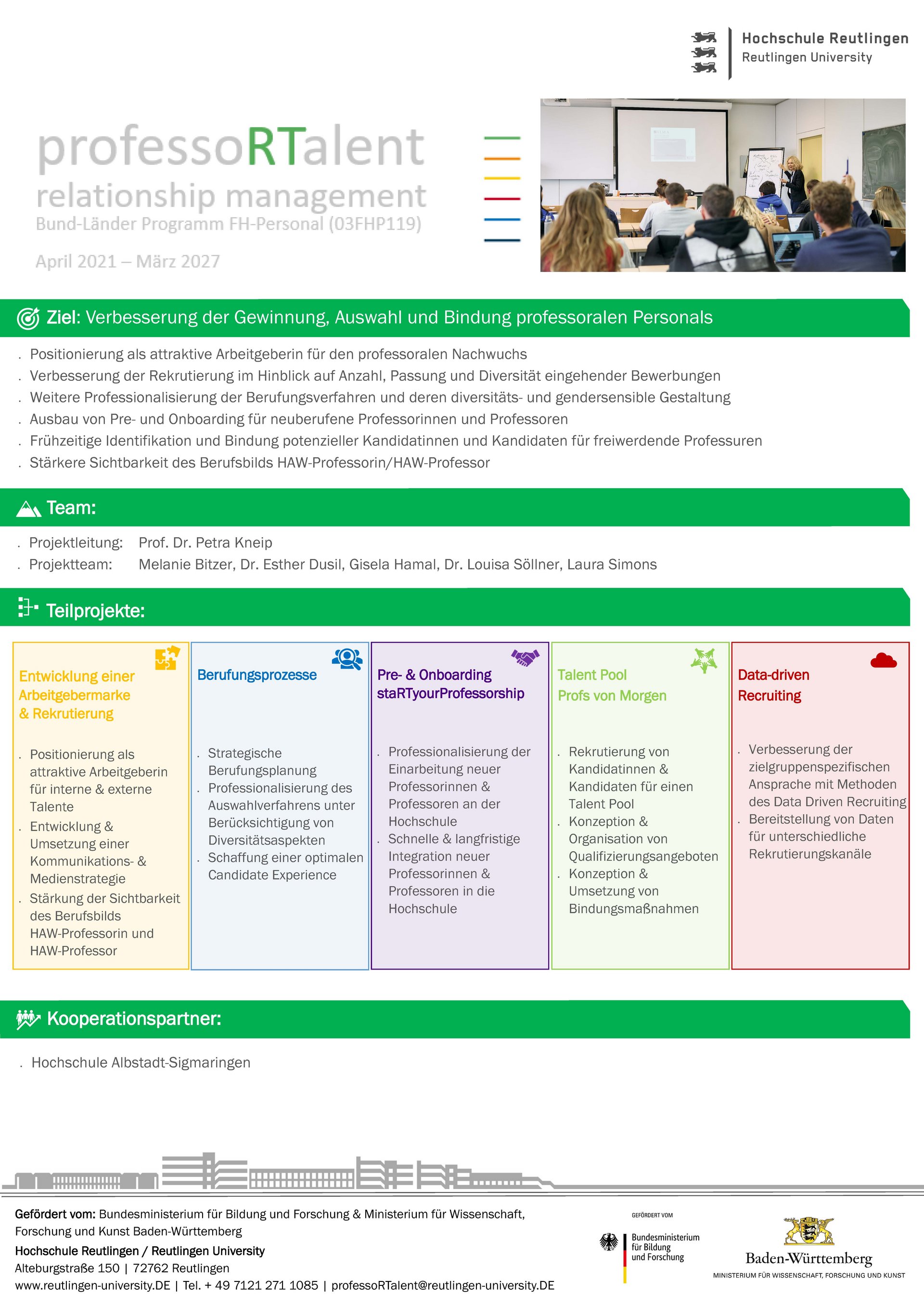 Im Rahmen des Programms "FH-Personal" fördern Bund und Länder Konzepte zur nachhaltigen Personalgewinnung an Fachhochschulen bzw. Hochschulen für angewandte Wissenschaften. Ziel ist dabei, die Gewinnung und Qualifizierung von Professorinnen und Professoren zu stärken. An der Hochschule Reutlingen wird dieses Vorhaben als Projekt "professoRTalent" umgesetzt.