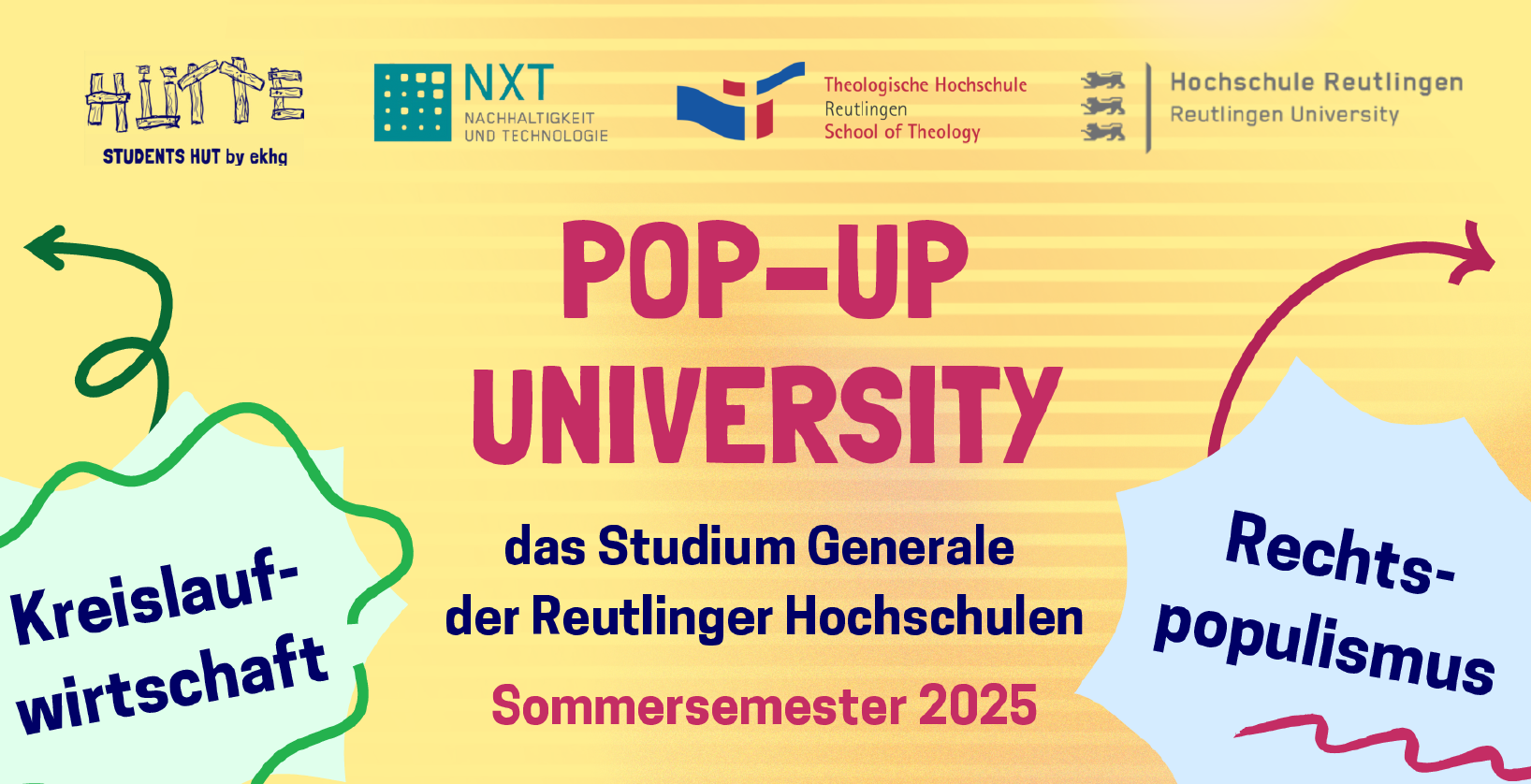 Tauchen Sie ein in eine Welt spannender Themen, die unsere Gesellschaft bewegen – kontrovers, aktuell und inspirierend! Die Pop-Up University der Reutlinger Hochschulen lädt Sie ein, nicht nur zuzuhören, sondern auch selbst aktiv zu werden. Erleben Sie jedes Semester hochkarätige Vorträge von Expert*innen aus Bildung, Kultur, Politik, Wirtschaft und Religion.